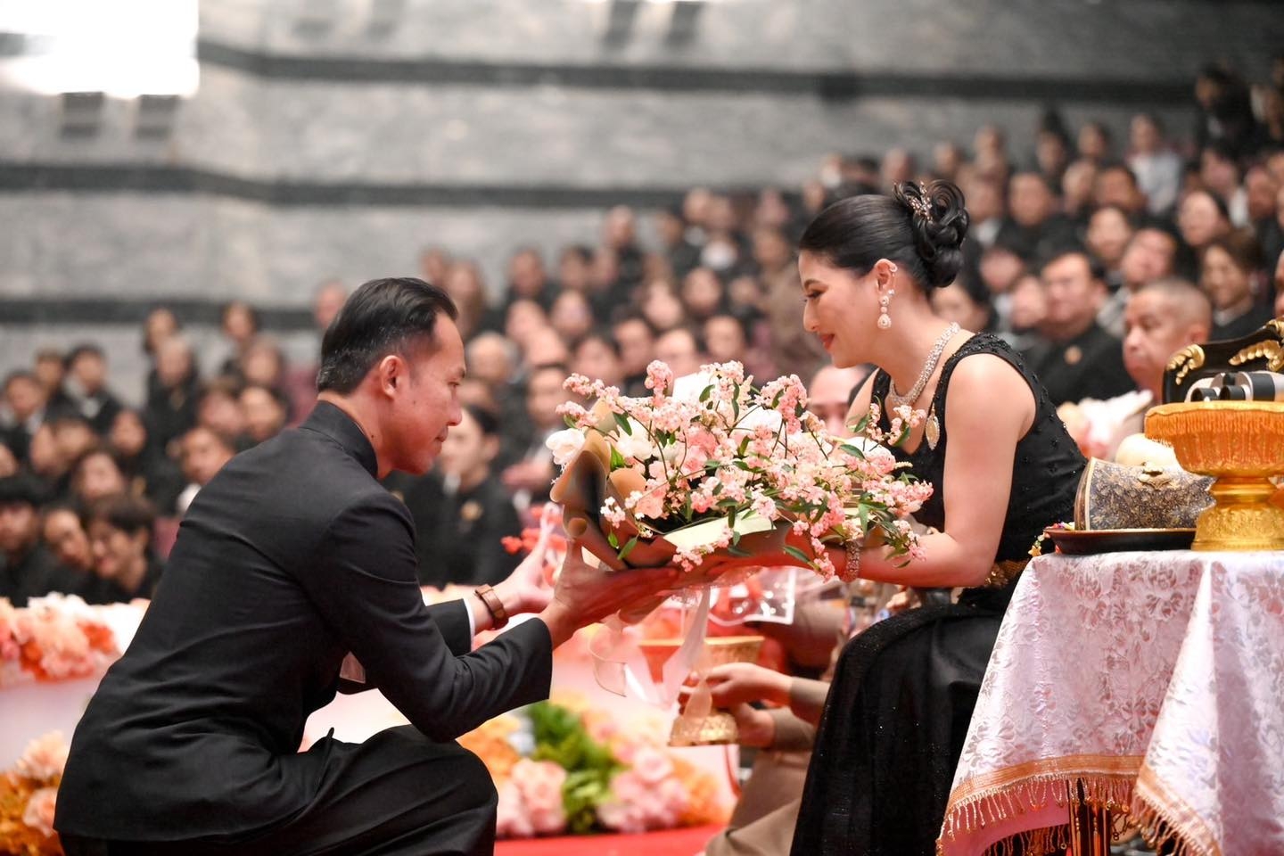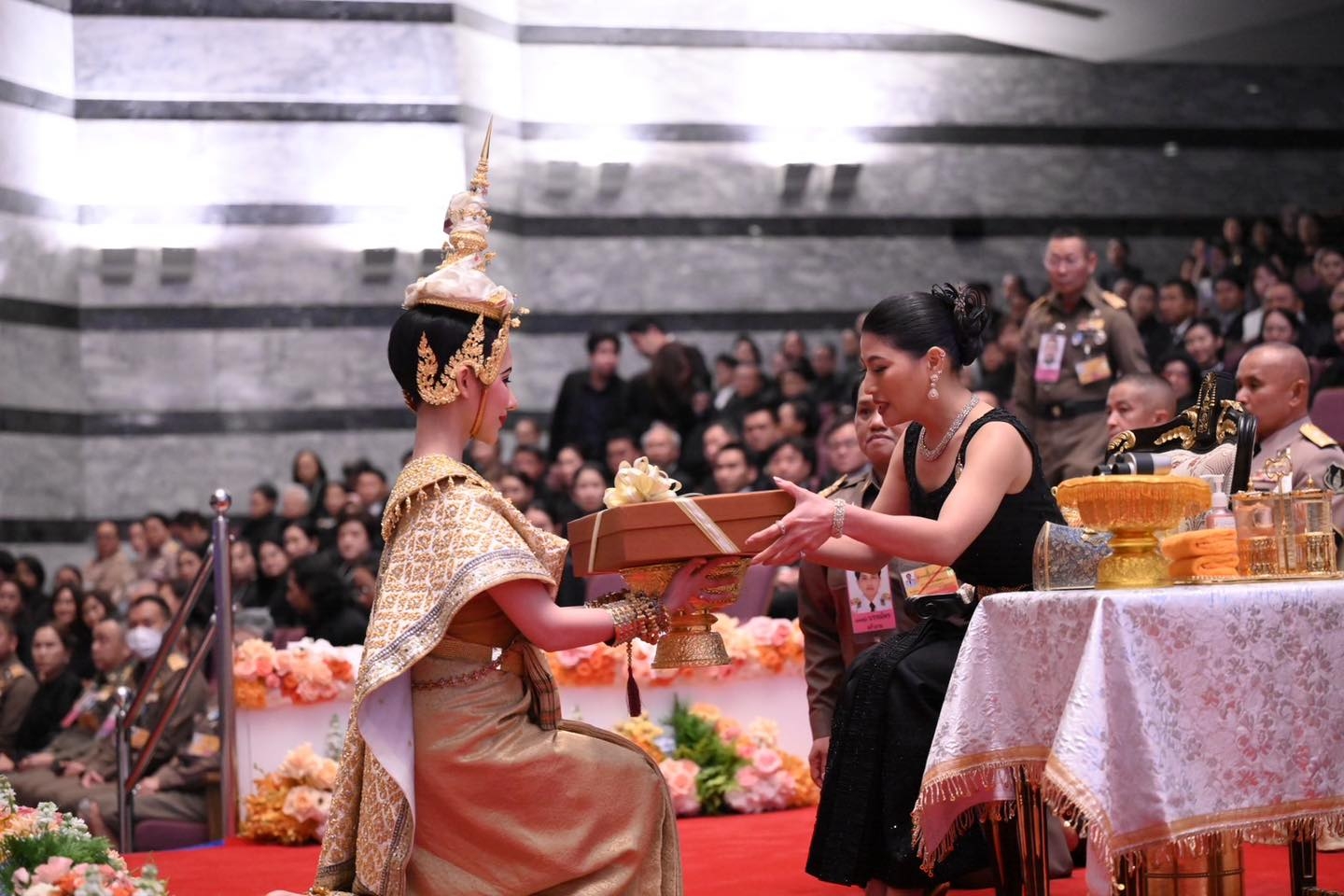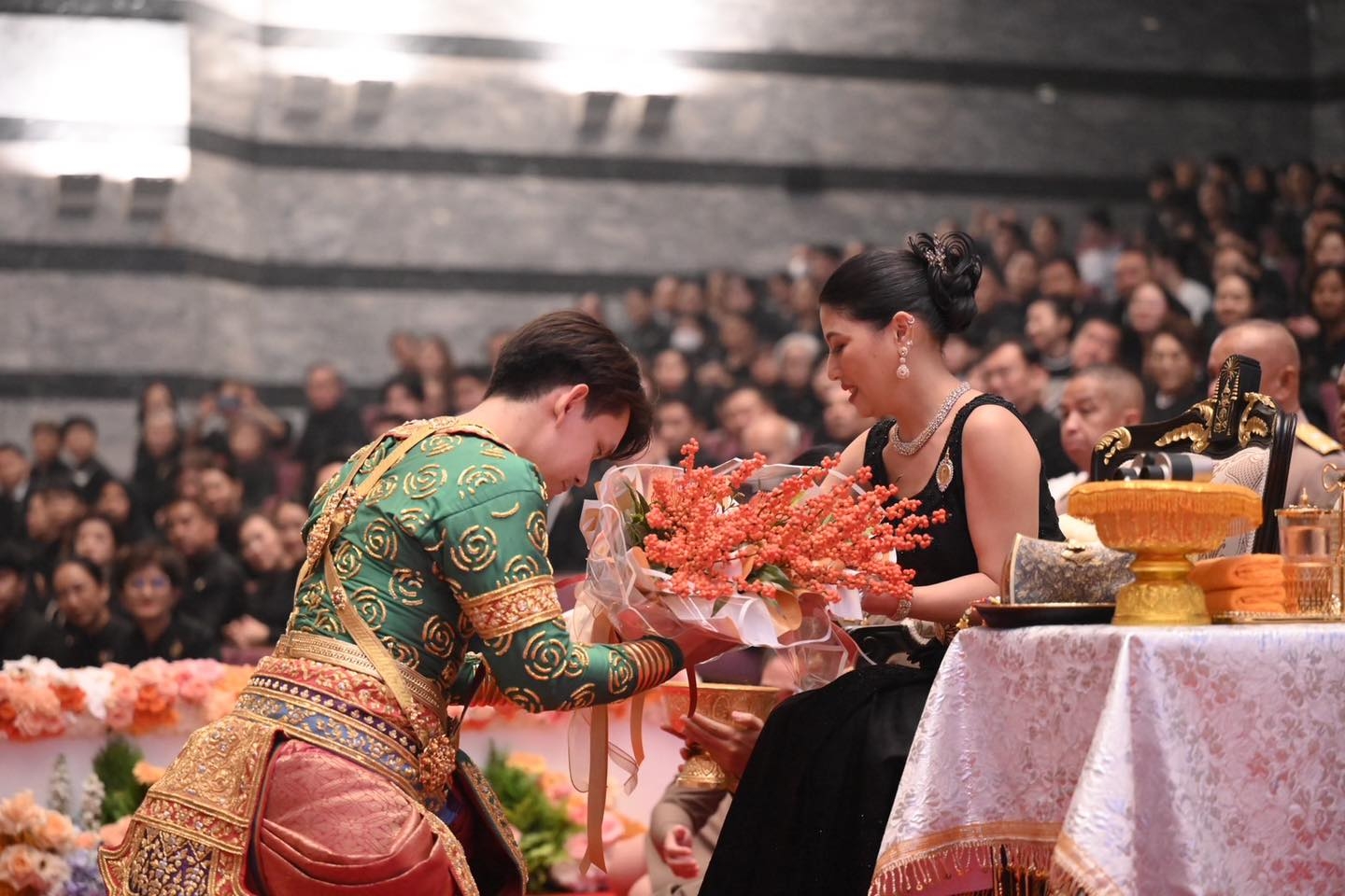 การนี้ เสด็จเข้าสู่หอประชุมใหญ่ ศูนย์วัฒนธรรมแห่งประเทศไทย พระราชทานพระวโรกาสให้ นางสาวนิตติกาล สุขกลิ่น (ผู้แสดงมณโฑ) ผู้แทนนักแสดงทูลเกล้าฯ ถวายสูจิบัตร แล้วทอดพระเนตรการแสดงรำอาศิรวาทรำลึกพระมหากรุณาธิคุณ ทอดพระเนตรวีดิทัศน์เบื้องหลังการจัดการแสดงโขนรอบปฐมทัศน์ เรื่อง รามเกียรติ์ ตอน สัตยาพาลี และทอดพระเนตรการแสดงตามลำดับ และเมื่อจบการแสดง พระราชทานพระวโรกาสให้ นาวาอากาศเอก สุพัฒน์ แก้วภา ประจำสำนักพระราชวังพิเศษ ระดับ 10 เบิกผู้แทนคณะทำงาน และนักแสดง โขนมูลนิธิส่งเสริมศิลปาชีพฯ ได้แก่ รองศาสตราจารย์ ศุภชัย จันทร์สุวรรณ์ ศิลปินแห่งชาติ/ผู้กำกับการแสดง นายสมศักดิ์ ทัดติ ผู้แทนผู้เชี่ยวชาญและครูผู้ฝึกซ้อมการแสดง (โขนยักษ์) นายลำยอง โสวัตร ผู้แทนครูผู้ฝึกซ้อมการบรรเลงและขับร้อง นายวิชัย รักชาติ ผู้แทนฝ่ายศิลป์ ฉากและอุปกรณ์การแสดง และนายธันย์ชนก อุ่นบางหลวง (ผู้แสดงพาลี) ผู้แทนนักแสดง เข้าเฝ้ารับพระราชทานช่อดอกไม้